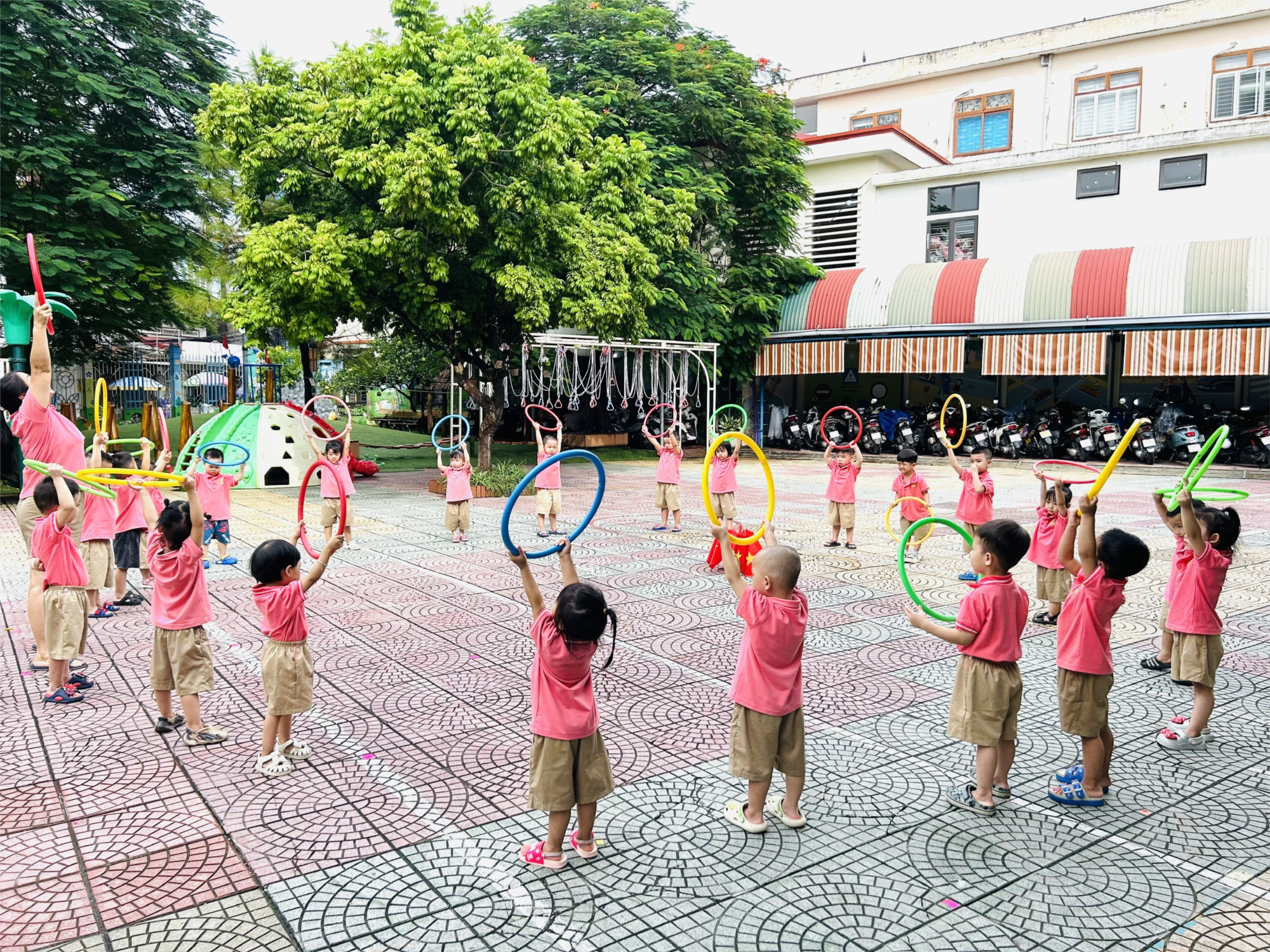 Với những chiếc vòng đầy màu sắc, các con được cùng cô tham gia những trò chơi vận động vui nhộn, rèn luyện sự khéo léo, nhanh nhẹn và tinh thần đoàn kết, hợp tác.