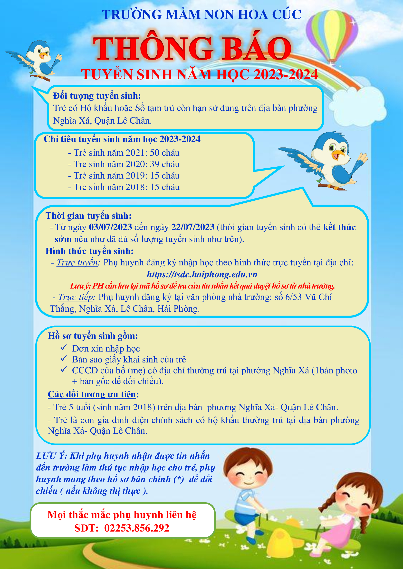 Căn cứ Công văn số 996/SGDĐT-KTKĐ ngày 14/4/2023 của Sở Giáo dục và Đào tạo, Công văn số 1469/UBND- GDĐT ngày 15/5/2023 của Ủy ban nhân dân và Phòng Giáo dục và Đào tạo Quận Lê Chân về việc hướng dẫn Tuyển sinh vào các lớp đầu cấp năm học 2023-2024;